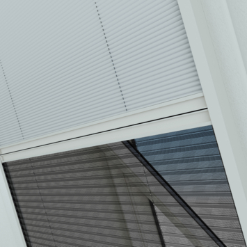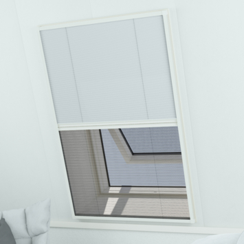 Met de Livn duoplissé vliegenraam Plus houd je insecten buiten en kun je tegelijkertijd de kamer verduisteren. Deze multifunctionele hor, speciaal ontworpen voor dakramen, combineert insectenwering en verduistering in één slim ontwerp. Het frame is gemaakt van witte aluminium profielen (RAL9010) en valt daardoor bijna onzichtbaar weg tegen een witte achtergrond. De Livn duoplissé vliegenraam Plus is geschikt voor dakramen tot een maximale opening van 50 x 95 cm. Dankzij het soepel schuivende plissésysteem blijft de hor in elke gewenste stand staan en sluit deze strak af met een borstelafdichting. Aan de onderzijde bevindt zich het zwarte, geplisseerde polyester gaas dat insecten buiten houdt. Aan de bovenzijde is een lichtgrijs gemêleerd, geplisseerd verduisteringsdoek geplaatst. Beide delen kunnen naar wens over elkaar worden geschoven, waardoor je zelf de verhouding tussen lichtinval en insectenwering kunt regelen.