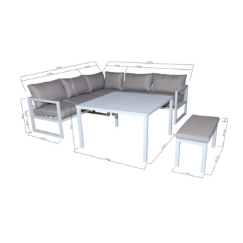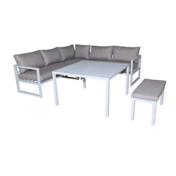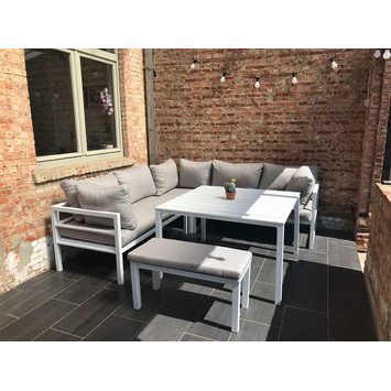 De Loungeset Chelva high dining wit is een beauty die elk tuinfeest naar een hoger niveau tilt. Dit prachtige en tijdloze tuinmeubel (inclusief kussens) is gemaakt uit aluminium en bestaat uit een hoekbank voor ruim 4 personen, een eettafel en bankje. Wedden dat je vrienden in de rij zullen staan? Zet de barbecue alvast klaar, ontkurk een fles of twee en geniet van een gezellige babbel in de buitenlucht.
