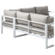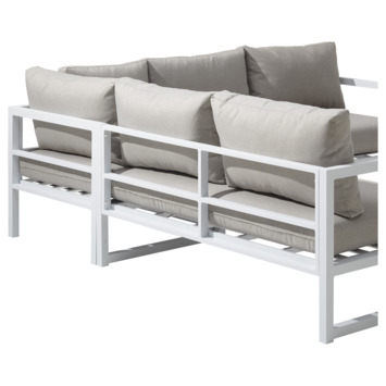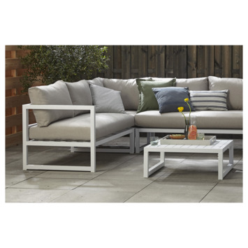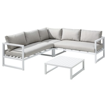 De Loungeset Chelva wit is een beauty die elke tuinfeest naar een hoger niveau tilt. Dit prachtige en tijdloze tuinmeubel (inclusief kussens) is gemaakt uit aluminium en bestaat uit een hoekbank voor ruim 4 personen en een witte tafel. Wedden dat je vrienden in de rij zullen staan? Zet de barbecue alvast klaar, ontkurk een fles of twee en geniet van een gezellige babbel in de buitenlucht.