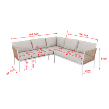 Met deze compacte loungeset Ivy is het buiten genieten. De afmetingen, het gebruikte materiaal en de afwerking zorgen voor een heerlijke tuinbeleving. Het frame heeft een witte poedercoating welke het aluminium beschermt tegen roest. Het gevlochten wicker geeft de loungeset een natuurlijke en duurzame uitstraling. Je ruimte wordt optimaal benut. Deze loungeset is 68 centimeter hoog, 194,5 centimeter breed en 126,5 centimeter diep met een zitdiepte 61,5 centimeter. De dikte van de zitkussens is 10 centimeter.