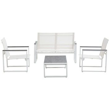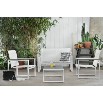 De loungeset Kaapstad combineert wit aluminium met wit textileen op een robuuste, maar gezellige manier. De set bestaat uit een tweezit, twee eenzits en een rechthoekig tafeltje. Ideaal voor wie van minimaal design houdt.
