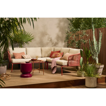De Loungeset Kopenhagen terracotta kunststof geeft je een vaste plek om gezellig samen te zitten in je tuin of op je terras. De hoekopstelling zorgt ervoor dat je met 5 personen comfortabel kan plaatsnemen, zonder dat het krap aanvoelt. Ideaal voor lange zomeravonden of een rustig koffiemoment buiten.