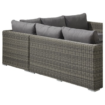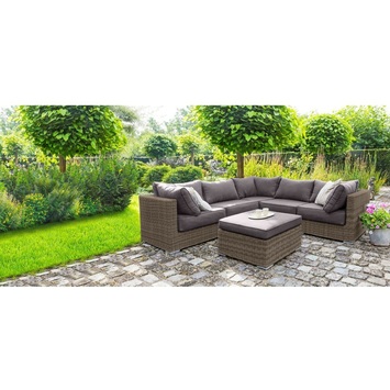 De loungeset Levante is een moderne loungeset voor 5 personen. De set bestaat uit 1 grote hoekvormige zitbank en 1 bijzettafeltje / poef met een authentieke look & feel, dankzij het gebruik van wicker in de kleur grijs. De comfortabele zetel beschikt over arm- en rugsteunen, evenals extra dikke kussens in de kleur grijs voor extra comfort. Deze tuinmeubelset is ideaal voor wie graag familie en vrienden ontvangt in een losse, uitgelaten sfeer. Geen volk over de vloer? Dan kan je zelf languit van je gloednieuwe loungeset genieten! Goed om te weten: wicker is een weerbestendige gevlochten kunststof die tegen een stootje kan. Is je loungeset toch vuil geworden? Dan kan je hem gewoon reinigen met water en een milde zeep.