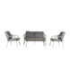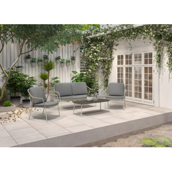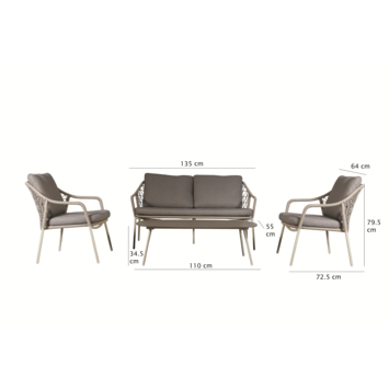 De set bestaat uit een 2-zitsbank, twee comfortabele zetels en een bijzettafel. De bijgeleverde grijze zit- en rugkussens voegen niet alleen extra comfort toe, maar zorgen ook voor een harmonieus geheel. Of je nu wilt relaxen of gezellig wilt samenzijn, deze set biedt de perfecte plek.