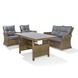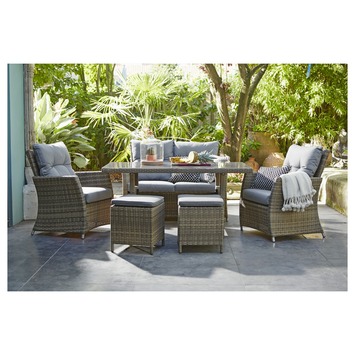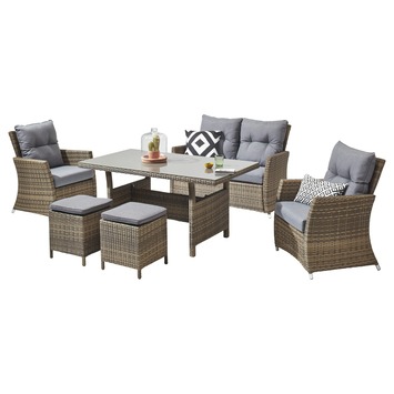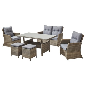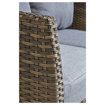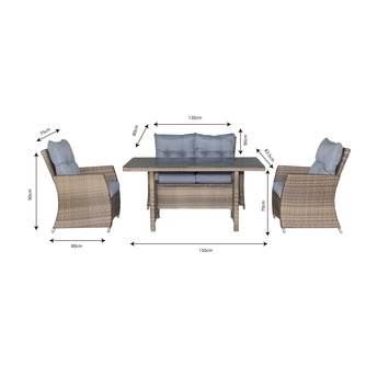 Een loungeset en een eetset in één? Kies voor deze loungeset Marseille! De set voor 4 personen bestaat uit 1 zitbank, 2 stoelen en 1 hoge rechthoekige tafel met een elegant tafelblad uit veiligheidsglas. De set is gemaakt uit wicker in de kleur bruin. De comfortabele zitbank en stoelen beschikken over arm- en rugsteunen, evenals afneembare kussens in de kleur grijs voor extra comfort. Deze tuinmeubelset is ideaal voor wie graag familie en vrienden ontvangt om te aperitieven, te tafelen én lekker lang na te genieten. Goed om te weten: wicker is een weerbestendige gevlochten kunststof die tegen een stootje kan.
