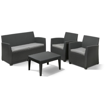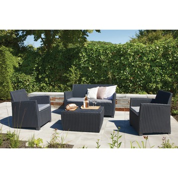 De loungeset Mia van Allibert is gemaakt uit kunststof in de kleur antracietgrijs en heeft een gevlochten wickerlook. De set bestaat uit 1 zitbank, 2 stoelen met comfortabele arm- en rugleuningen, evenals 1 lage rechthoekige tafel die je ook als kussenbox kan gebruiken. En da's mooi meegenomen, want de moderne set wordt geleverd inclusief grijze zitkussens. Goed om te weten: tuinmeubelen uit kunststof zijn onderhoudsvrij, weerbestendig en stevig.
