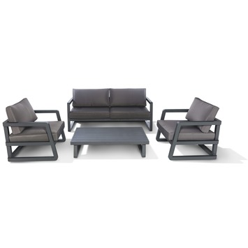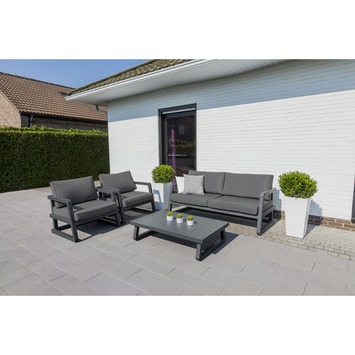 De loungeset Nice is een eigentijdse loungeset voor 4 personen gemaakt uit aluminium in de kleur antraciet. De set die je enkel en alleen bij GAMMA kan kopen bestaat uit 1 zitbank, 2 stoelen en 1 rechthoekige lage tafel. De comfortabele zitbank en stoelen beschikken over arm- en rugsteunen, evenals afneembare kussens in de kleur grijs voor extra comfort. Deze tuinmeubelset is ideaal voor wie graag familie en vrienden ontvangt in een ontspannen zuiderse sfeer. Geen volk over de vloer? Dan kan je zelf languit van je gloednieuwe loungeset genieten! Goed om te weten: aluminium tuinmeubelen hebben een moderne look & feel en zijn makkelijk mooi te houden.