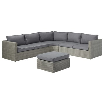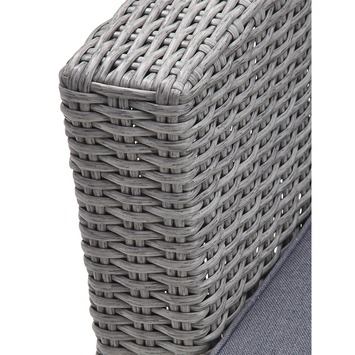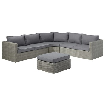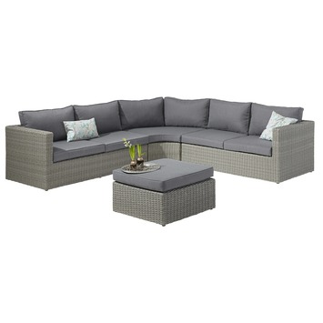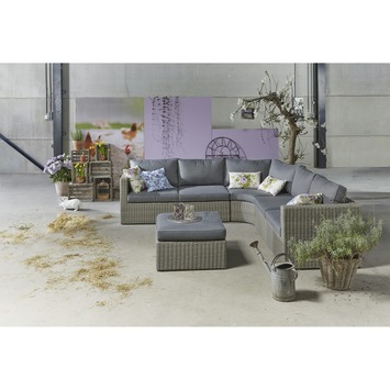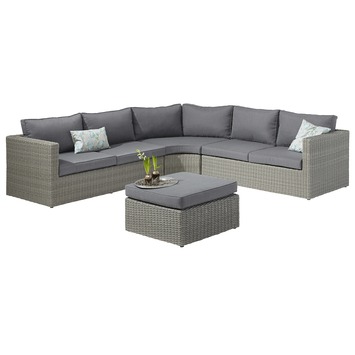 Haal de zomer in huis met de loungeset Palma. De zomerse set bestaat uit een ronde hoekset en een vierkant tafeltje, beide gemaakt in halfronde wicker. De grijze zit- en rugkussens zijn inbegrepen in de set, die ideaal is om te relaxen of gasten te ontvangen. Enkel verkrijgbaar als set.