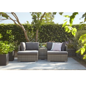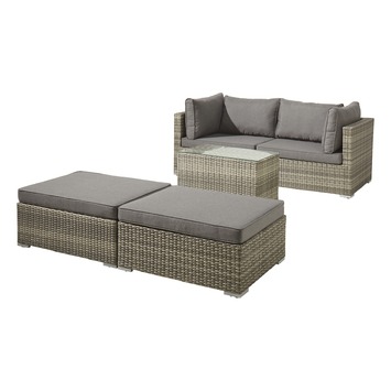 De loungeset Santiago is een multifunctionele loungeset voor 2 à 4 personen. De loungeset bestaat uit 2 zetels, 2 bijzetstoelen / poefs en 1 bijzettafel met een elegant tafelblad uit veiligheidsglas die je op verschillende manieren bij én in elkaar kan zetten. Zo kan je zelf je favoriete opstelling creëren: afhankelijk van de beschikbare ruimte, het aantal personen en wat je wilt doen. Rechtop zitten, languit chillen of stiekem een dutje doen? Alles kan in deze tuinmeubelset gemaakt uit wicker in de kleur donkergrijs. Inclusief zitkussen en rugkussens in de kleur donkergrijs. Goed om te weten: wicker is een weerbestendige gevlochten kunststof die tegen een stootje kan.