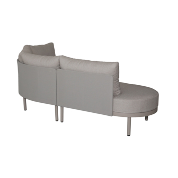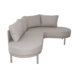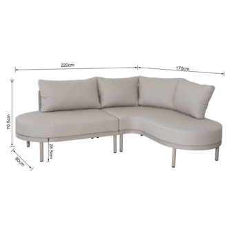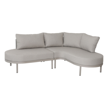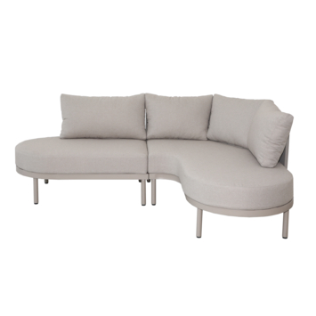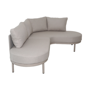 Het hoekontwerp met organische lijnen geeft de zithoek een speelse en uitnodigende uitstraling. Het volledig beige frame zorgt voor een rustige en harmonieuze look die past in moderne en natuurlijke tuinen.