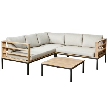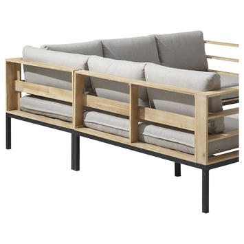 Deze loungeset Zion combineert een industriële stijl met warm hout, wat een moderne en stijlvolle look creëert voor in je tuin. Door het speels ontworpen geraamte heeft deze set een zeer open uitstraling en past hij op verschillende plekken in je buiteninterieur. Het onderstel is gemaakt van zwart staal en het geraamte van geolied acaciahout (hardhout). De Loungeset Zion wordt geleverd met een salontafel, dat over een stalen onderstel beschikt en een blad van geolied acaciahout (hardhout). En de kussens? Die krijg je er ineens bij! Kortom, met deze set kan je deze zomer gegarandeerd zorgeloos genieten!