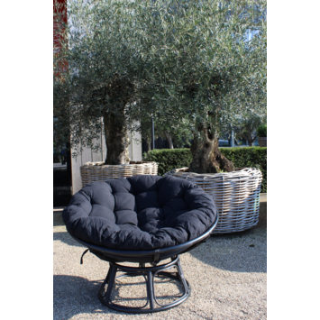 De Papasan loungestoel in zwart rotan is een echte blikvanger voor onder je overkapping of in je tuinhuis. Met zijn zithoogte van 50 cm en royale ronding vormt hij een heerlijke plek om te ontspannen. Het stevige rotanframe in diepe zwarte kleur geeft de stoel een moderne, luxe uitstraling, terwijl de robuuste constructie jarenlang zitplezier garandeert. Het bijpassende zwarte zitkussen is dik en zacht, zodat je meteen comfortabel zit. Of je nu geniet van een rustig moment met een boek of gezellig kletst met vrienden, deze Papasan biedt altijd de perfecte zitplek. Je ontvangt hem volledig gemonteerd, klaar om neer te zetten en direct te gebruiken. Voor het mooiste behoud plaats je hem binnen of beschut buiten.