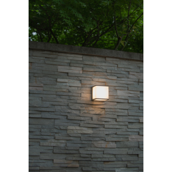 Deze LED-wandlamp in antracietgrijs zit in een kubusvormige houder van aluminium. Het elegante design springt in het oog en straalt krachtige stralen van warm wit licht uit die de wand verlichten.