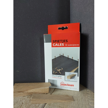 Om er voor te zorgen dat je laminaat of parket door vocht- of temperatuurverschillen kan uitzetten en krimpen is het belangrijk om bij de plaatsing van laminaat of parket steeds een uitzetvoeg te voorzien langs alle wanden. Om er voor te zorgen dat het laminaat op z'n plaats blijft tijdens de plaatsing kan je deze Maclean spietjes gebruiken. In deze verpakking vind je 32 houten Maclean spietjes.