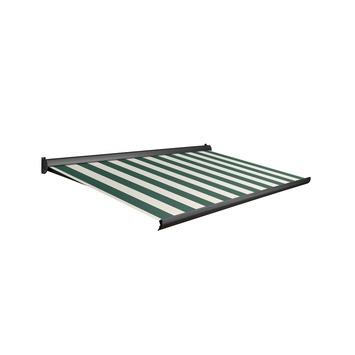 Het Factor 10 scherm is de uitgekiende startersversie onder de terrasschermen. Deze wordt uitgevoerd met het gestreept groen/crème kleurig doek (D517) uit de DomaSol® doekcollectie. Hiermee kiest u voor een hoogwaardig prijs/kwaliteit verhouding. Dit semi-cassettescherm wordt met slechts 2 steunen gemonteerd in de kleur antraciet (RAL 7016). De maximale breedte is 350 cm bij een uitval van 250 cm. Bij schermen breder dan 450 cm wordt standaard een middensteuntje meegeleverd. Het scherm is te bedienen met een betrouwbare slingerstang of optioneel uit te rusten met een Somfy LT motor met schakelaar.