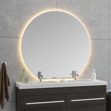 Met deze ronde Neris spiegel haal je een praktische blikvanger in huis. De ingebouwde led-verlichting met dimfunctie zorgt voor precies het juiste licht, van warm tot koel. Je bedient alles makkelijk met de touch-button in het glas. Zo pas je de kleurtemperatuur en lichtsterkte aan jouw voorkeur aan. Na een uur schakelt de verlichting automatisch uit, zodat je geen onnodige stroom verbruikt. Handig is ook de verwarming onderin. Die voorkomt condens op het verwarmde deel van 25 x 35 cm, waardoor je altijd een helder beeld hebt, ook na het douchen. De spiegel heeft een diameter van 120 cm en is 0,3 cm dik. Het diffuse licht komt via een kunststof strip en geeft een zachte gloed in je badkamer.