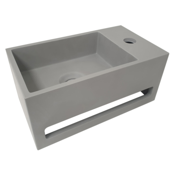 Ben je op zoek naar een compacte wastafel met een robuuste uitstraling en kraangat rechts? Deze variant in betonlook heeft een moderne, vierkante vorm en een geïntegreerde handdoekhouder. Handig als je geen ruimte hebt voor extra haakjes. De wastafel is vervaardigd uit solid surface: een sterk composiet dat goed bestand is tegen vocht, vlekken en krassen. Je hebt nauwelijks schoonmaakmiddelen nodig. Je stelt deze wastafel helemaal zelf samen met een kraan, sifon en afvoer. Gebruik voor dit model een vaste afvoer in plaats van een clickafvoer. Met zijn compacte afmetingen is deze wastafel ideaal voor kleine toiletruimtes met een stoere uitstraling.