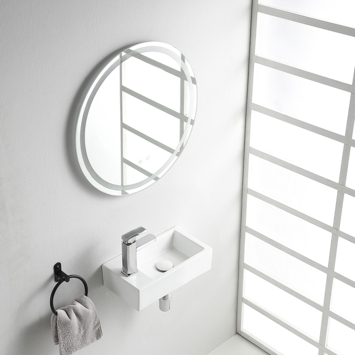 Dit compacte model past zelfs in een smalle toiletruimte. De Ondine M met kraangat links is 40 cm breed en 22 cm diep, waardoor je het gemakkelijk kunt plaatsen. Ideaal als het leidingwerk zich aan de linkerkant bevindt. Het glanzend witte keramiek zorgt voor een frisse, moderne look en is bovendien eenvoudig schoon te maken. Je stelt het volledig naar wens samen: kies je eigen kraan, sifon en waste en maak het precies zoals jij het wilt. Deze variant heeft geen overloop. Gebruik daarom een vaste waste in plaats van een clickwaste, zodat het water goed kan weglopen. De strakke vorm en het gladde oppervlak zorgen voor een nette uitstraling en praktisch gebruiksgemak.