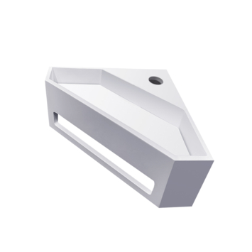Slim, strak en ruimtebesparend. Deze Silara hoekoplossing past in vrijwel elke toiletruimte en springt meteen in het oog door de scherpe lijnen en het compacte ontwerp. De vorm zorgt ervoor dat het netjes in de hoek hangt, zonder dat het krap aanvoelt. Dankzij de vaste handdoekhouder hang je de handdoek direct onder de wastafel. Het materiaal is mat wit solid surface: een sterke composiet die goed tegen vocht, vlekken en krassen kan. De fontein heeft geen overloop en geen waste, maar een afschuinende afvoer waardoor het water vanzelf wegloopt. Het kraangat zit in het midden, zodat je zelf een bijpassende kraan kunt kiezen.