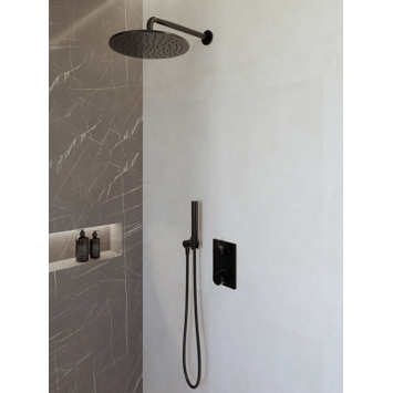 Een opgeruimde look én praktisch in gebruik: deze mat zwarte inbouwset combineert beide. De brede regendouche geeft een comfortabele waterstraal, terwijl je met de handdouche eenvoudig afwisselt. Het 2-weg systeem laat je soepel schakelen tussen beide functies. De matzwarte kleur is goed bestand tegen vlekken en vingerafdrukken, wat het onderhoud vergemakkelijkt. Ideaal voor wie houdt van een rustige, minimalistische uitstraling in de badkamer. Inbegrepen bij deze inbouw regendouche set: