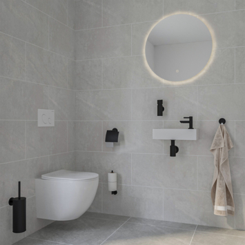 Deze minimalistische Marho Luxor toiletborstel met houder in mat zwart past in ieder toilet. De houder heeft een uitneembare kunststof binnenpot waardoor je hem altijd gemakkelijk kan reinigen. Bovendien ziet de borstel er door de zwarte borstelkop altijd hygiënisch uit. Verder is de toiletborstel gemaakt van hoogwaardige materialen en monteer je hem eenvoudig aan de wand met de meegeleverde schroeven en Fischer pluggen. De Luxor serie omvat daarnaast ook een groot aantal andere accessoires in dezelfde stijl voor aankleding van de badkamer en toiletruimte.