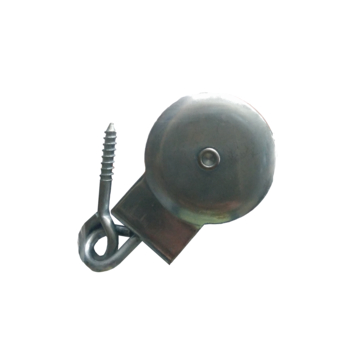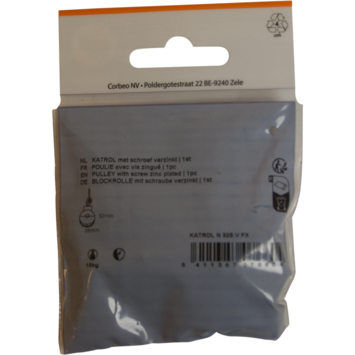 Katrol uit verzinkt staal met nylon wiel van 32 mm voor touw van 6 mm. De katrol is voorzien van een schroef om in een wand te bevestigen.