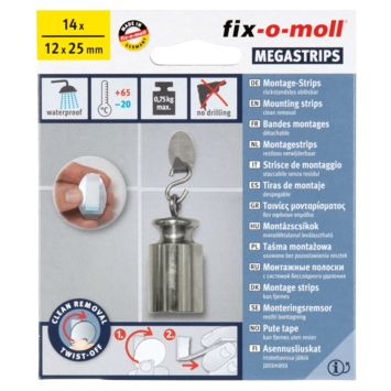 MEGASTRIPS voor het bevestigen van kleine voorwerpen op gladde oppervlakken binnenshuis. De montagestrips hebben een hoge kleefkracht aan beide zijden en kunnen worden verwijderd zonder resten achter te laten. Ze zijn vochtbestendig en daardoor tevens geschikt voor gebuik in de badkamer.