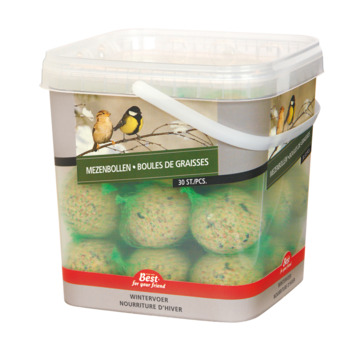 Mezenbollen zijn een van de bekendste vogelvoederproducten die er zijn. Ze zitten vol met gezonde vetten en zaden. In deze emmer zitten 30 mezenbollen.