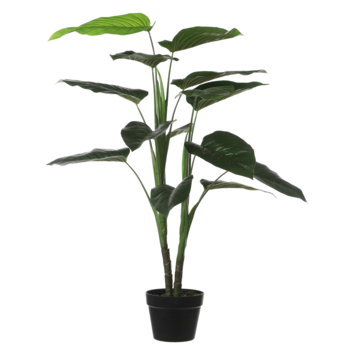 Klaar om zorgeloos te genieten? De kunstplanten zijn niet van echt te onderscheiden, maar hebben geen enkel onderhoud nodig. Deze Philodendron valt op door de grote bladeren op enkele stelen. Het blad is uitgevoerd in verschillende maten en groentinten voor een extra natuurlijk effect. De plant is stevig verankerd in een zwarte kunststof pot, maar moet voor gebruik wel nog in model worden gebracht. Vuistregel: het blad moet je aankijken. Zet hem na het uitvouwen zo neer, of gebruik de kunststof pot als stevige basis voor een sierlijke overpot. Combineer hem met andere kunstbloemen en -planten uit de collectie en breng meer groen in huis. De Philodendron is ca. 100 cm hoog en heeft een diameter van 70 cm.