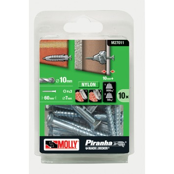 De Molly nylon plug met schroef 10x50 mm is een plug die je voor diverse werkzaamheden binnen- en buitenshuis kan gebruiken (geschikt voor baksteen, holle wanden en gipsplaten). Deze pluggen zijn geleverd met vijzen van 7x60 mm met PZ3 kop. Een verpakking bevat 10 stuks.