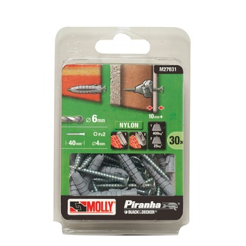 De Molly nylon plug met schroef 6x30 mm is een plug die je voor diverse werkzaamheden binnen- en buitenshuis kan gebruiken (geschikt voor baksteen, holle wanden en gipsplaten). Deze pluggen zijn geleverd met vijzen van 4x40 mm met PZ2 kop. Een verpakking bevat 30 stuks.