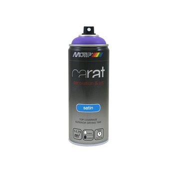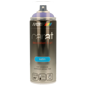 Motip Carat is een lak voor decoratieve doeleinden. Geschikt voor het lakken van behandelde en onbehandelde ondergronden zoals hout, metaal, aluminium, glas, steen en diverse soorten kunststof. De lak heeft een zeer hoge dekkracht en een duurzame kleur en glans. De lak is krasvast en stootvast, evenals bestand tegen chemicaliën en weersinvloeden. Verkrijgbaar in verschillende kleuren, waaronder zijdeglans Blueberry Violet (400 ml).