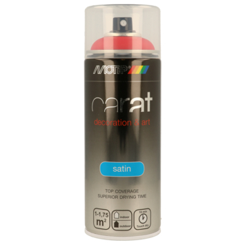 Motip Carat is een lak voor decoratieve doeleinden. Geschikt voor het lakken van behandelde en onbehandelde ondergronden zoals hout, metaal, aluminium, glas, steen en diverse soorten kunststof. De lak heeft een zeer hoge dekkracht en een duurzame kleur en glans. De lak is krasvast en stootvast, evenals bestand tegen chemicaliën en weersinvloeden. Verkrijgbaar in verschillende kleuren, waaronder zijdeglans Traffic Red (400 ml).
