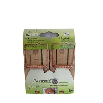 Floraworld produceert klassieke muizenvallen uit stevig hardhout. Plaats het lokaas onder de roestbestendige beugel en laat de val zijn werk doen. Nadat de val toegeklapt is, kan je de muis veilig verwijderen en de val hergebruiken. Raak je de muis liever niet aan? Dan gooi je deze voordelige val weg en gebruik je de tweede. Gebruik biociden veilig. Lees vóór gebruik eerst het etiket en de productinformatie.