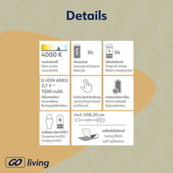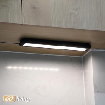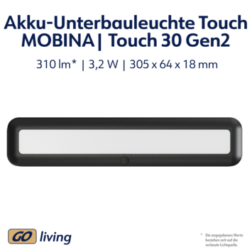 Mobina Push 30 is een zwarte onderbouwlamp van Müller-licht, ideaal voor bijvoorbeeld onder je keukenkastjes. De draadloze lamp heeft een ingebouwde ledlichtbron van 2 watt die zorgt voor een neutraal wit licht met een lichtopbrengst van 200 lumen. De installatie is eenvoudig door een zelfklevende strip.Je kunt de lamp aan- en uitzetten met de grote schakelaar. Aan de zijkant van de lamp is er nog een schakelaar waarmee je de automatische uitschakeltijd kunt instellen: 3 of 15 minuten. Mobina Push 30 is oplaadbaar via de meegeleverde USB-kabel. Volledig opgeladen kan de lamp tot 3 uur branden. De laadtijd bedraagt ook 3 uur.