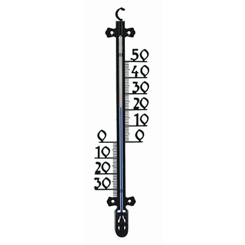 Van deze stijlvolle zwarte kunststof thermometer van Nature met afmetingen van 25x6x1cm lees je altijd de juiste temperatuur af. De thermometer geeft de omgevingstemperatuur nauwkeurig weer door middel van de blauwe kwikmeter. Je bevestigt de kunststof thermometer eenvoudig aan een muur. Let op! Niet iedere plek is geschikt. hang je de thermometer vol in de z'n of juist compleet in de schaduw, dan kan dit de gegevens vervalsen. De thermometer heeft een minimale temperatuur van -30 graden Celsius en een maximale temperatuur van 50 graden Celsius. Ten slotte is de kunststof thermometer weerbestendig en 25cm lang.