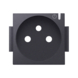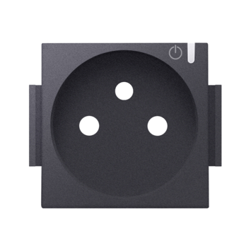 Afwerkingsset voor geconnecteerd schakelbaar stopcontact met penaarde en bedieningsknop. De set bevat geen schroeven maar wordt gewoon op het systeem vastgeklikt voor snellere installatie. De vlakke afwerkingsset is uitgerust met een kleine transparante drukknop die de ledstatus toont en de geconnecteerde schakelaar aan- en uitschakelt.