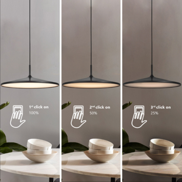 Dankzij de Moodmaker™ 3-staps dimfunctie kun je de lichtsterkte eenvoudig aanpassen via een standaard wandschakelaar, zonder extra dimmer. De lamp verbruikt slechts 17,5 watt en heeft een lange levensduur van circa 25.000 uur. Een zwarte textielkabel van 2 meter maakt flexibele montage mogelijk, terwijl de kunststof diffuser zorgt voor een aangename, gelijkmatige lichtverdeling. Geschikt voor droge binnenruimtes (IP20) en ontworpen voor wie houdt van functioneel design met een minimalistische uitstraling.