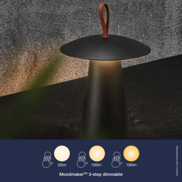 Deze kleine, draagbare vloer- of tafellamp, Ara, is perfect voor het verlichten van warme zomeravonden op je balkon of terras. De lamp heeft een schattig kegelvormig design met zachte leren details. Gemakkelijk mee te nemen en te plaatsen waar je hem nodig hebt. Creëer de perfecte verlichting met de ingebouwde 3-staps Moodmaker™-dimmerfunctie en een batterijduur tot 80 uur.