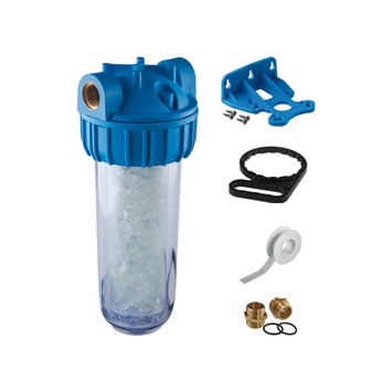 Deze O'Pure premium all-in-one proportionele doseringsfilter behandelt kalk in stads-, regen- en putwater en beschermt leidingen en toestellen tegen kalkaanslag. De kit bevat een transparante bokaal met polyfosfaatpatroon, 4 ophangbeugels met vijzen, sleutel, teflonrol en 2 nippels 3/4”. Het systeem is eenvoudig te monteren en volledig ingesteld voor een stabiele werking bij een maximale druk van 6 bar en watertemperaturen tussen 0 en 60°C. Het materiaal is niet-giftig en geschikt voor drinkwater, met een verstevigde polypropyleen filterkop en SAN-bokaal. Zo heb je een complete, overzichtelijke oplossing voor kalkbehandeling in huis. Shop deze O'Pure kalkwaterbehandeling compleet bij GAMMA.