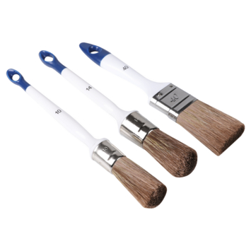De OK borstelset voor watergedragen verf maat 10, 14 en 40 is een set van drie borstelen die je gebruikt voor verf op waterbasis. In de set zitten twee ronde borstelen van 10 en 14 millimeter en één platte borstel van 40 millimeter, waarmee je zowel kleine details als grotere vlakken kan schilderen. Je gebruikt deze borstelen op gladde en ruwe ondergronden zoals MDF of baksteen. De haren zijn synthetisch en daardoor geschikt voor acrylverf, beits, muur- en plafondverf, lak en voorstrijkmiddel omdat ze de verf goed verdelen zonder veel haarverlies. De kunststof handvaten liggen stevig in de hand. Aan het blauwe uiterlijk zie je dat deze borstelenset speciaal gemaakt is voor verf op waterbasis.