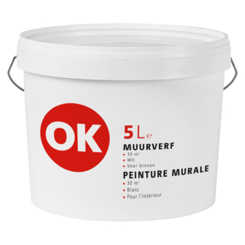 OK muurverf wit 5 liter is een matte verf geschikt voor muren en plafonds. De verf is ontwikkeld voor het schilderen van alle droge vertrekken binnenshuis. Eén emmer van 5 liter volstaat voor het schilderen van een oppervlakte van 30 m2. OK muurverf is een prima verf voor het opfrissen van diverse vertrekken.