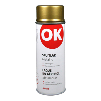 OK spuitlak goud metallic is een sneldrogende lak voor ondergronden van hout, metaal, aluminium, glas, steen en diverse soorten kunststof. Ideaal voor moeilijk te schilderen oppervlakken zoals buizen, rotan en spijlen. Voor een optimale hechting wordt aangeraden vooraf OK spuitlak primer wit aan te brengen. Het metallic effect wordt versterkt door het aanbrengen van een aflaklaag alkyd blanke lak. Deze spuitlak is zowel binnen als buiten te gebruiken. Eén spuitbus van 400 ml volstaat voor het spuiten van een oppervlakte van 1,5 tot 2 m2. Droog na 15 minuten.