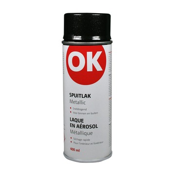 OK spuitlak zwart metallic is een sneldrogende lak voor ondergronden van hout, metaal, aluminium, glas, steen en diverse soorten kunststof. Ideaal voor moeilijk te schilderen oppervlakken zoals buizen, rotan en spijlen. Voor een optimale hechting wordt aangeraden vooraf OK spuitlak primer wit aan te brengen. Het metallic effect wordt versterkt door het aanbrengen van een aflaklaag alkyd blanke lak. Deze spuitlak is zowel binnen als buiten te gebruiken. Eén spuitbus van 400 ml volstaat voor het spuiten van een oppervlakte van 1,5 tot 2 m2. Droog na 15 minuten.