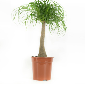 De Olifantspoot of Beaucarnea is een echte eyecatcher door zijn bijzondere uiterlijk: een woeste groene kruin op een stevige poot. De plant is 80 centimeter hoog met een potmaat van 24 centimeter. Door de grote knol onderaan de stam heeft de plant de bijnaam Olifantspoot gekregen. De Beacarnea komt oorspronkelijk uit Mexico en slaat net als cactussen en vetplanten water op in de verdikking van de stam. Door deze slimme wateropslag kan de Olifantspoot zelfs enige tijd zonder water. Verzorgingstips voor de Beaucarnea? De Olifantenpoot is een makkelijke plant in de verzorging. De plant heeft relatief weinig water nodig. In de zomer kan de plant af en toe wat vloeibare voeding gebruiken. Door zijn eigen wateropslag in de stam kan de plant met name in de winter wel enkele weken zonder water. De Beacarnea houdt bij voorkeur van een lichte standplaats. Wees in de zomer voorzichtig met direct zonlicht op de bladeren. Wordt de plant te groot? Geen probleem. Je kan gewoon de stam afzagen, zo lang je dit maar niet bij het dikke deel doet.
