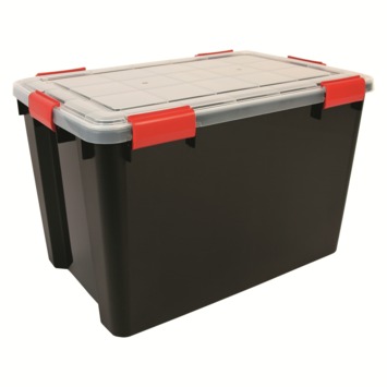 De stapelbare opbergbox Weathertight (70 liter) van het merk Iris is een stevige opbergdoos uit kunststof in de kleur zwart. De rechthoekige opbergbox is afgewerkt met rode hengsels en een transparant deksel, zodat je makkelijk weet wat je waar opbergt. Daarnaast beschikt deze compacte opbergbox over handgrepen, zodat je de box makkelijk kan opheffen / verplaatsen. Goed om te weten: de stapelbare opbergbox Weathertight met een inhoud van 70 liter is ook verkrijgbaar met een inhoud van 50 liter.