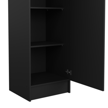 Achter de deur vind je vier legplanken en een roede. Hierdoor is de kast geschikt voor het ophangen en opvouwen van kleding, maar ook voor het opbergen van schoenen of accessoires. Met zijn hoogte van 200 cm en breedte van 49,2 cm biedt Cosmo veel ruimte, terwijl hij toch compact blijft.