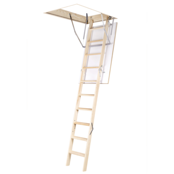 3-delige opvouwbare zoldertrap met houten ladder en thermisch geïsoleerd luik. Het luik is aan beide zijden wit van kleur en heeft een dikte van 26 mm (U = 1,54 W/m²K). Zowel de kast als de ladder bestaan uit massief grenenhout. Voor een duurzame stabiliteit zijn de slipvaste treden ingewerkt in de trapbomen dmv een zwaluwstaart-verbinding. De speciale dichtingsband in de kast zorgt voor een hoge klasse van luchtdichtheid. Het luik wordt dicht gehouden door een plastic klikslot.