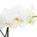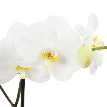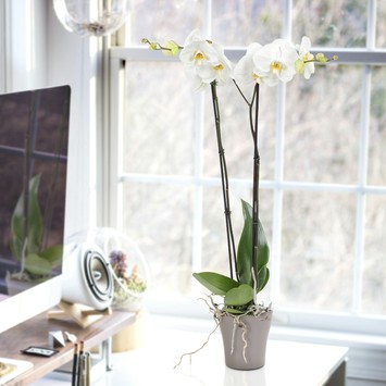 Deze witte orchidee (Grandi Flora) bestaat uit 2 takken met prachtige witte bloemen. De grote orchidee is 85 centimeter hoog en heeft een pot met een diameter van 15 centimeter. Verzorgingstips voor een Grandi Flora orchidee? De orchidee is lid van de familie Vlinderorchidee of Phalaenopsis en doet het goed op kamertemperatuur in een lichte plek, maar niet direct in de zon. Wanneer de aarde bijna droog is, is het tijd om water te geven (nl. elke 7 à 9 dagen). Besproei dan direct de jongste kopjes. Verder is een orchidee gebaat met extra voeding. Geef om de 2 weken een scheut speciale orchideeënvoeding. Voeg daarnaast 3 tot 4 per jaar een theelepel kalk toe aan de potgrond. Vermijd het mesten van november tot januari. Het is belangrijk om eens in de 3 jaar de grond te verversen. Check dan ook meteen of de wortels nog voldoende ruimte hebben in de pot. Zo niet, dan is het belangrijk om te verpotten. De Phalaenopis kan - nadat deze bijna is uitgebloeid - opnieuw tot bloei worden gebracht. Snij de bloemstengel - als er nog 2 of 3 bloemen aanzitten - boven het derde oog af. De stengel zal dan opnieuw uitlopen. Na 8 tot 12 maanden groeien er nieuwe bloemen. Goed, hé?