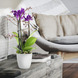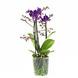 Deze paarse orchidee (Phalaenopsis) bestaat uit 3 takken met kleine bloemetjes. De kleurrijke orchidee is 40 centimeter hoog en heeft een pot met een diameter van 12 centimeter. Verzorgingstips voor een orchidee? De orchidee is lid van de familie Vlinderorchidee of Phalaenopsis en doet het goed op kamertemperatuur in een lichte plek, maar niet direct in de zon. Wanneer de aarde bijna droog is, is het tijd om water te geven (nl. elke 7 à 9 dagen). Besproei dan direct de jongste kopjes. Verder is een orchidee gebaat met extra voeding. Geef om de 2 weken een scheut speciale orchideeënvoeding. Voeg daarnaast 3 tot 4 per jaar een theelepel kalk toe aan de potgrond. Vermijd het mesten van november tot januari. Het is belangrijk om eens in de 3 jaar de grond te verversen. Check dan ook meteen of de wortels nog voldoende ruimte hebben in de pot. Zo niet, dan is het belangrijk om te verpotten. De Phalaenopis kan - nadat deze bijna is uitgebloeid - opnieuw tot bloei worden gebracht. Snij de bloemstengel - als er nog 2 of 3 bloemen aanzitten - boven het derde oog af. De stengel zal dan opnieuw uitlopen. Na 8 tot 12 maanden groeien er nieuwe bloemen. Goed, hé?